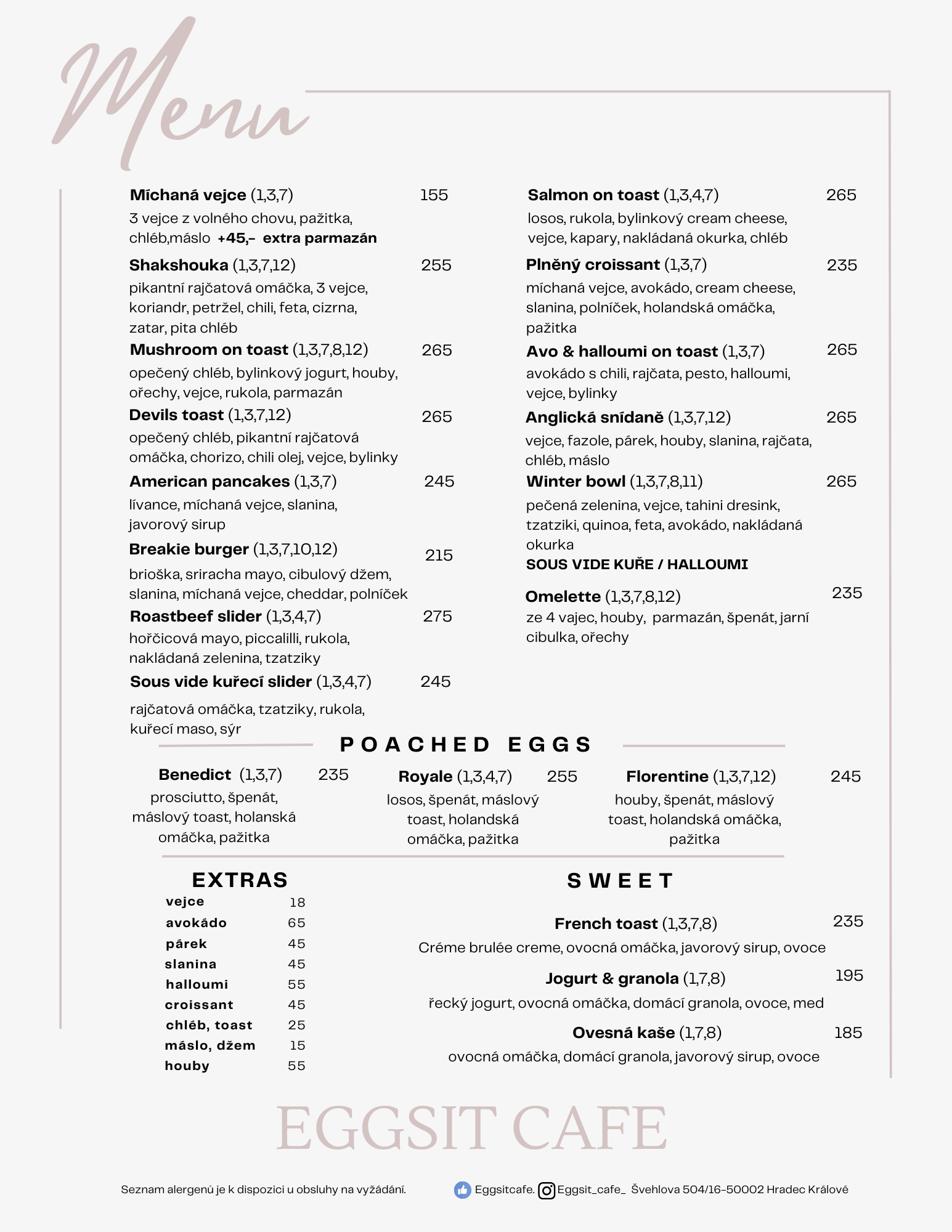 Přes odpoledne a večer se EGGSIT CAFE mění v pohodové místo na setkání s přáteli – zastavte se na osvěžující spritz, šálek kávy nebo něco sladkého z našeho domácího pultu plného koláčů, dortů a zákusků. V teplých dnech si navíc můžete vychutnat všechno dobré na naší krásné letní předzahrádce.